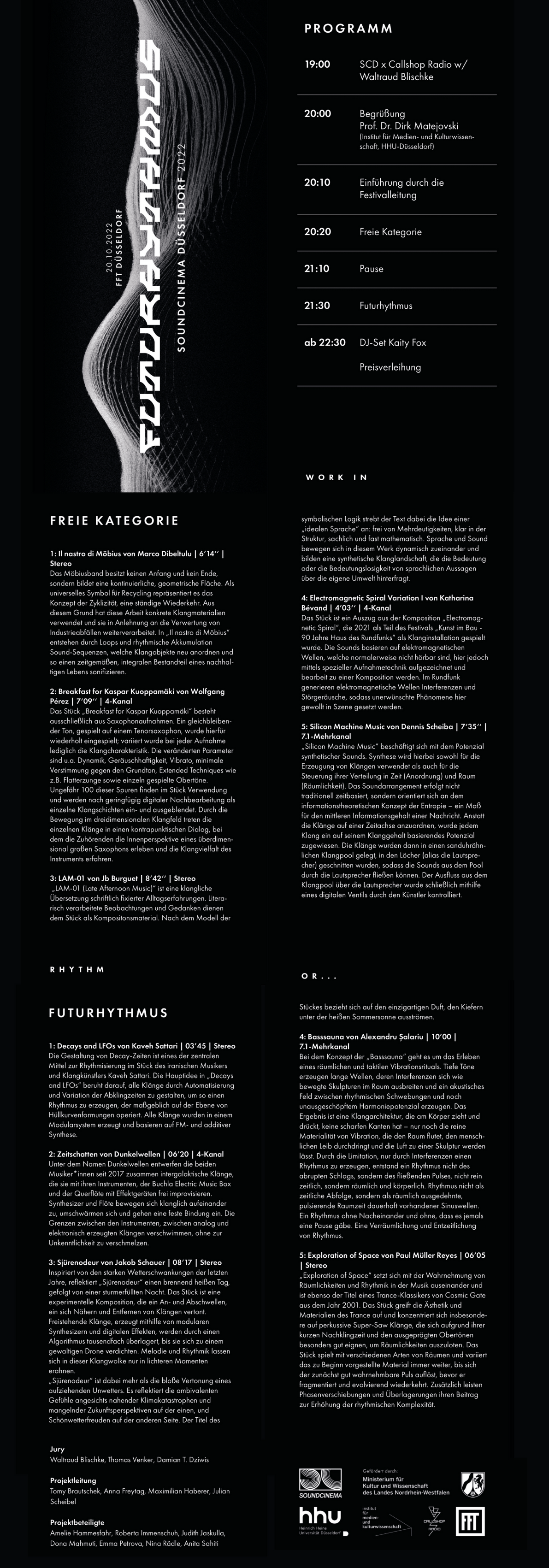 Für das Festival werden einmal jährlich über eine öffentliche Ausschreibung Soundbeiträge in Formaten von Stereo bis 7.1-Mehrkanal für einen jährlich wechselnden Themenschwerpunkt und eine freie Kategorie eingeworben. Gesucht werden musikalische Kompositionen, Klangcollagen, Klangexperimente, Soundscapes und narrative Audioformate, die sich durch einen transgressiven Impetus auszeichnen und darauf abzielen, konventionelle Hörerfahrungen zu unterlaufen.